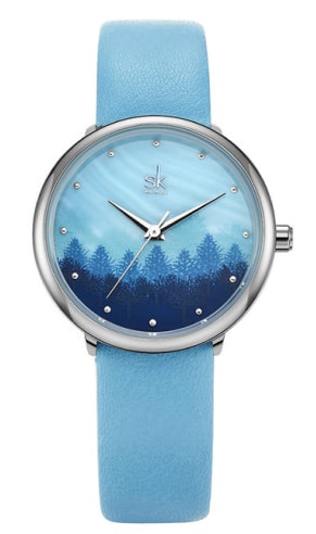 My main watch needed to go in for an overhaul, so I needed a watch to wear for a few weeks. This one is so nice that I am putting off my old watch for service! It’s so pretty and easy to wear, and the face is easy to read! I love the sky blue face and baby blue band, neutral but not boring. The slim leather band is comfortable and doesn’t feel heavy or sweaty like wider bands can feel on me. Even my watch snob husband said he loves it on me! Be aware it does tick, if that kind of thing bothers you. So happy with this purchase