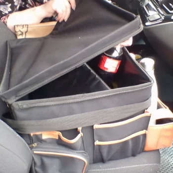 I've got this awesome thing on my passenger seat and I'm totally loving it! It makes it so simple to move all my stuff when I have passengers in the car. What's really cool is how easily the dividers adjust to fit larger things. I've got all sorts of useful items in there like a tire repair kit, wipes, paper towels, and a water bottle. And those little pockets are perfect for holding insurance cards, pens, and small notebooks. It's like a super convenient storage space right next to me!