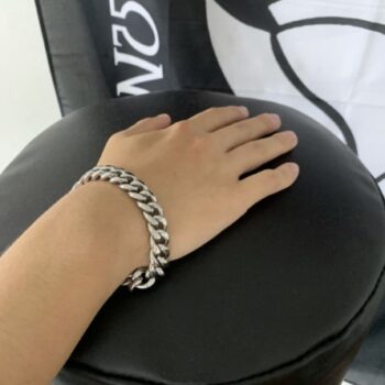 The item arrived in perfect condition. Upon opening, I found the bracelet to be of ideal weight: not too light as to feel inexpensive, but also not heavy enough to restrict my mobility. The clasp is furthermore extremely secure: I have thinner wrists, so this is a vital feature for me. The metal for this bracelet is well-polished and appears to have a platinum finish, which accents all of my outfits both casual and formal. This is an incredibly versatile bracelet, and I highly recommend this to any interested customer.