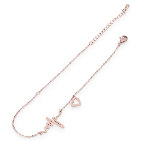 Crafted in stainless steel, this rose gold anklet features a heart rhythm followed by a pretty heart pendant. The love symbol is centered along a 9.8 in. + 2 in. cable chain that secures with a lobster claw clasp.