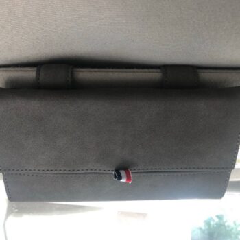 This sunglass holder is super useful. I always have prescription sunglasses in my purse, but when my fiancé rides my car he never remembers to bring sunglasses and any pair that I keep in the car always ends up following him back inside or he loses them. I got this so that I can always keep a spare pair of sunglasses in the car. I did find it’s a little cumbersome because the clips are too widespread so in order to have it not block the passenger visor mirror I need to have it hanging off the visor a bit.