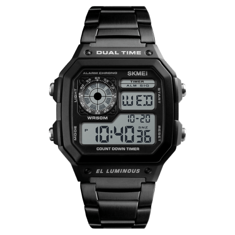 The case is made out of ABS and resin crystal with a stainless steel band. The clear digital display is easy to operate and is super durable thanks to its key scratch-resistant features and a stainless steel waterproof case cover.