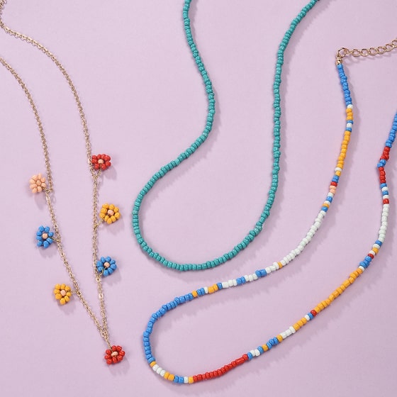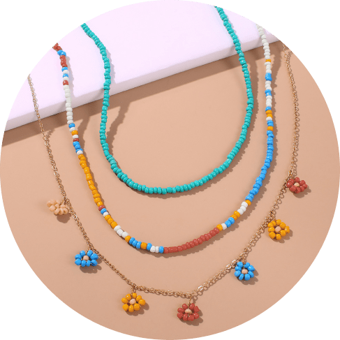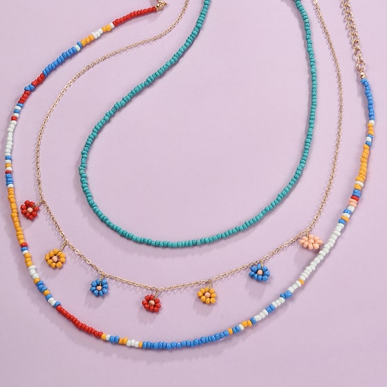 Number of layers: 3. The third layer has 7 bead flower pendants. Color: multicolor. Length: 18 in + 2.4 in, 20 in + 2.4 in, 22 + 2.4 in. Material: beads.