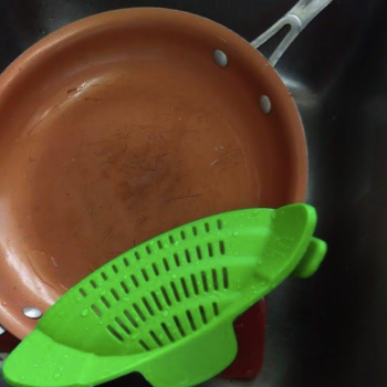This makes it so much easier to dump out water when making pasta of any type. Fits very well to most sized pans and dishwasher safe. My 9 yr old granddaughter can now dump the water out of the Mac and cheese easily. This is a must have for people who make Pastas of any kind that require dumping out hot water. It is made out of a type of rubber so I’m not sure if I would use it for hot grease, but it may be ok for that too since a lot of spatulas etc are made from similar material