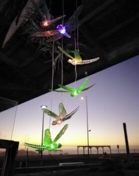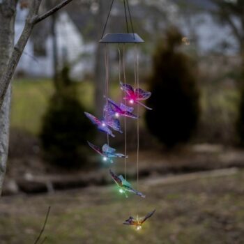 Cute solar chimes. I hang it by my window and use it as a night light. It goes on when it gets dark and stay on for about 3 hours. It is very relaxing watching it changing color when laying on bed.